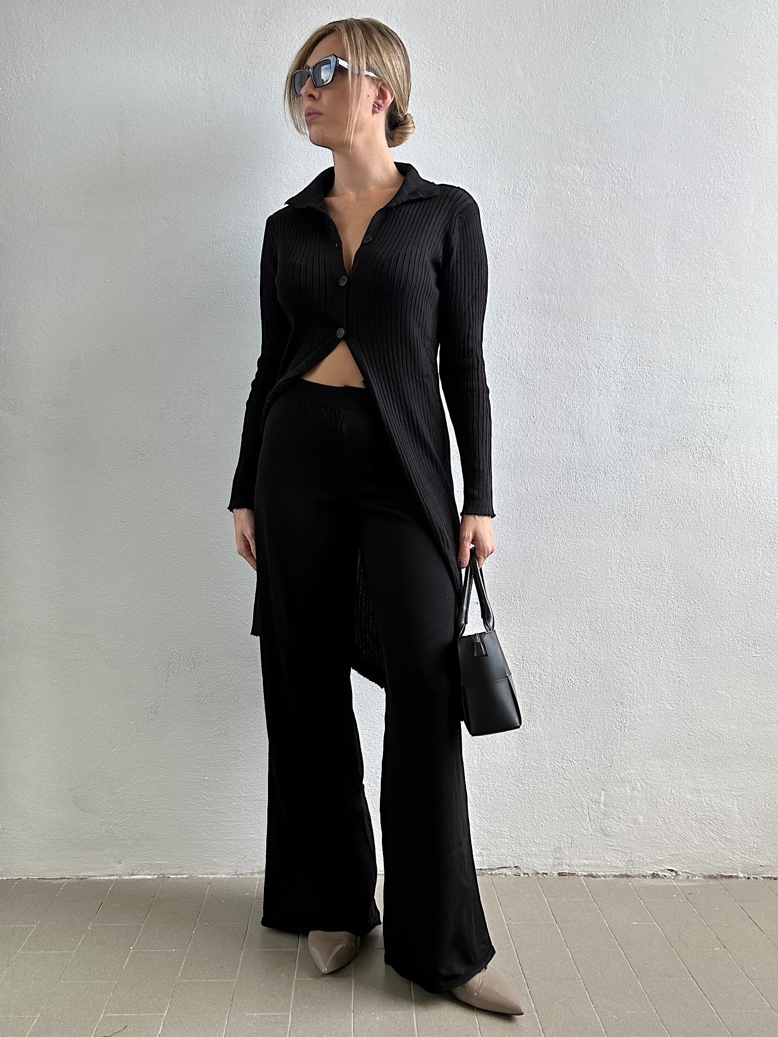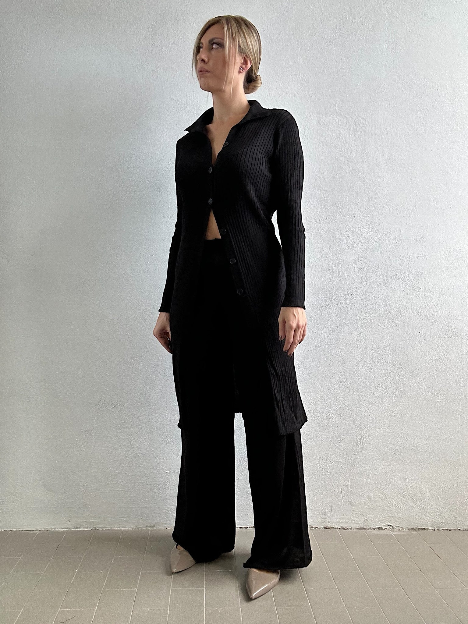 - Cardigan lungo a costine con bottoncini e pantalone elasticizzato wide leg
