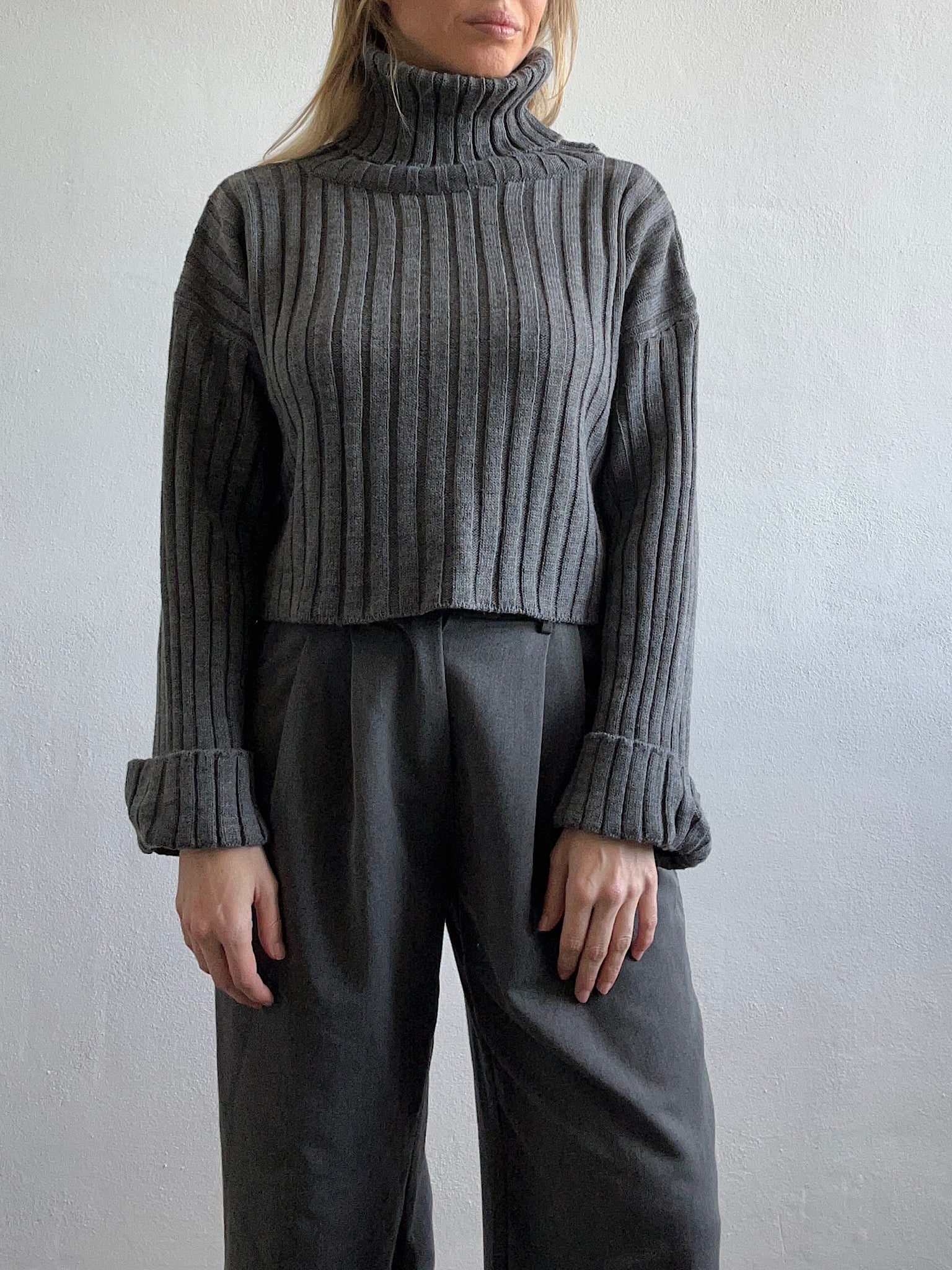 Pull crop a collo alto a costine ( grigio, nero e panna)